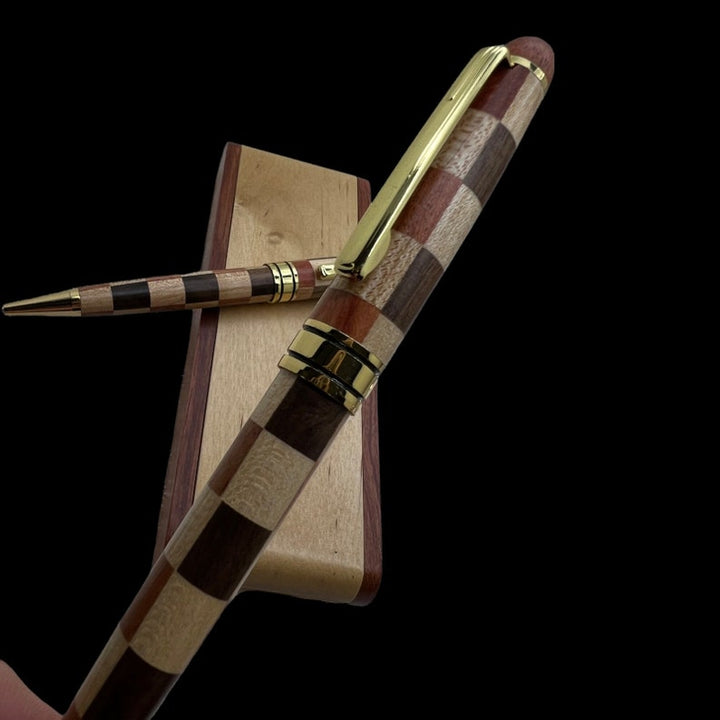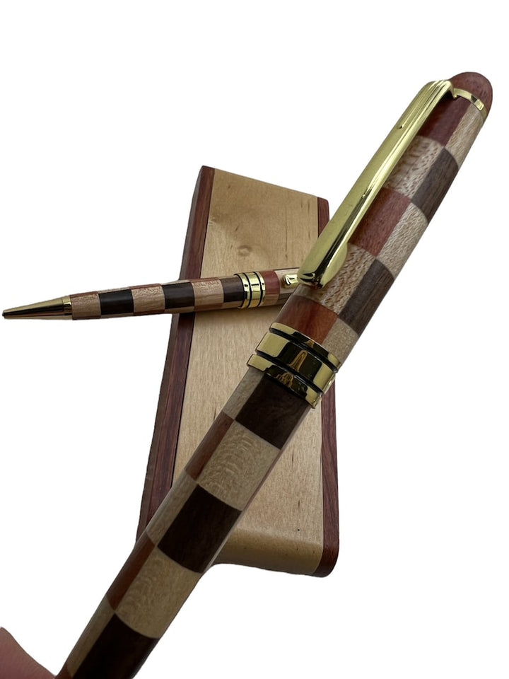 Comprising of 1 x ballpoint pen blue ink and one ballpoint pen black ink Luxury Desk-Top Holder / Display Stand / Case . Theses pens write so smoothly and are a pleasure to use and handle. The case opens into a fantastic, vertical standing desk-top stand, yet closes into a compact desk or travel case.The pens and case are made from contrasting woods Maple, Oak and Pine. The pens have a protective varnish giving them a subtle shine. The metalware is finished in 24k gold.