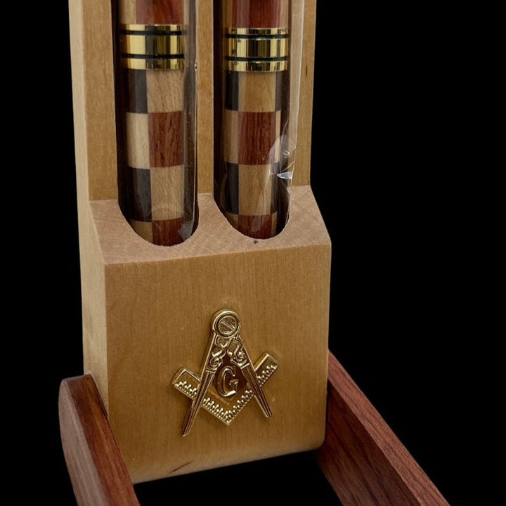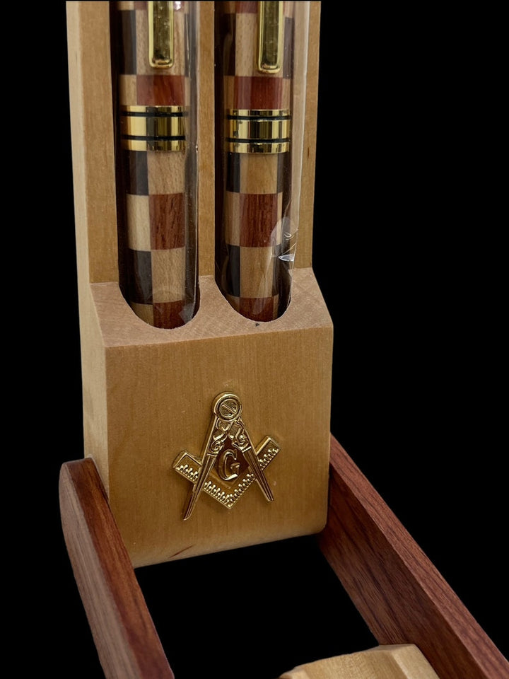 FREEMASON LUXURY SET by The British Gold Company The quality of this set really must be seen and handled in person to fully appreciate. Not wood effect, not wood-look, not plastic - Real solid Wood and superbly crafted too.Beautiful Double Desk Top Pen Set in folding Wooden Case - 24k Gold clad trim - A superb set.